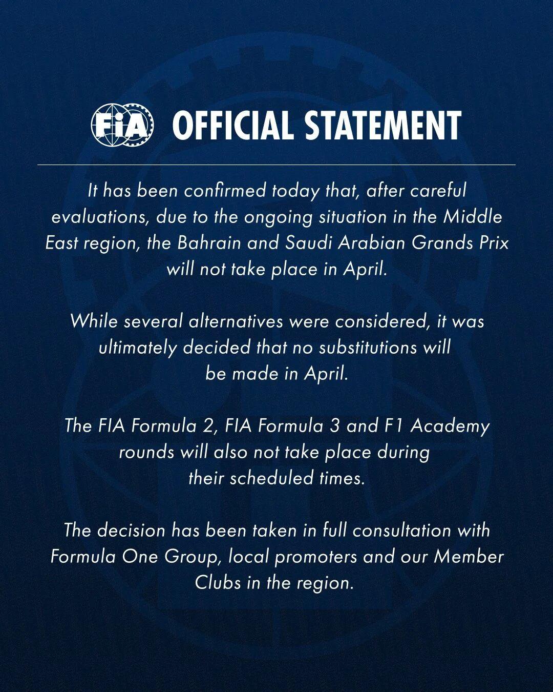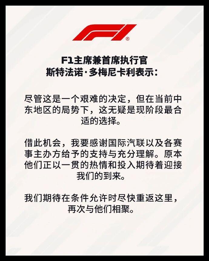 就在今天上午,F1官方确认了本赛季巴林和沙特阿拉伯大奖赛将不会在四月进行。官方声明中表示,由于受中东地区当前局势影响,原定的F1连同F2、F3和F1学院赛事将不会如期举行。尽管考虑了其他备选方案,但四月将不会安排替代赛事。